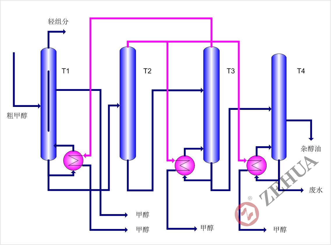 泽华开发的甲醇隔板精馏工艺,将隔壁塔与多效蒸馏过程相结合,其工艺优势如下: