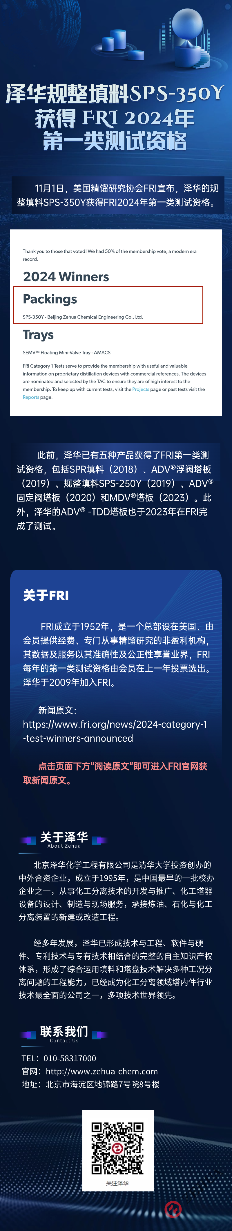 泽华规整填料SPS-350Y获得FRI 2024年第一类测试资格