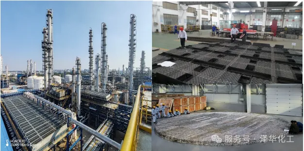 2021年,泽华完成东华能源宁波丙烷脱氢二期装置丙烯塔改造项目。该塔采用六溢流固阀塔板结构,开车后效率很低,丙烯产品纯度仅为95mol%左右,远低于设计值。受限于改造时间、空间,这次改造难度极大。泽华迎难而上,通过详细的工艺模拟和水力学计算提出了改造方案,在不拆除原塔板的条件下,在塔内对原设备局部进行定点改造,仅用半个月时间就完成了施工。装置重新开车后,丙烯塔效率显著提升,塔顶丙烯纯度提升到99.6mol%以上,为项目业主创造了巨大的经济效益。